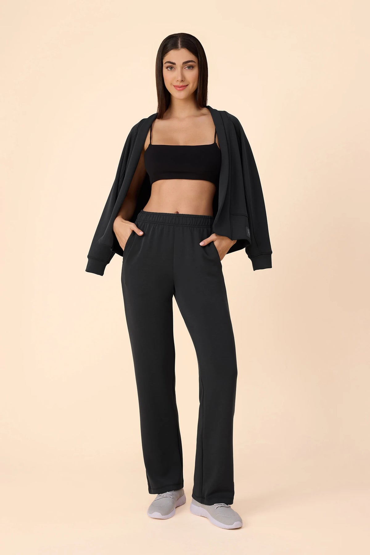 Full length with a straight, relaxed leg.