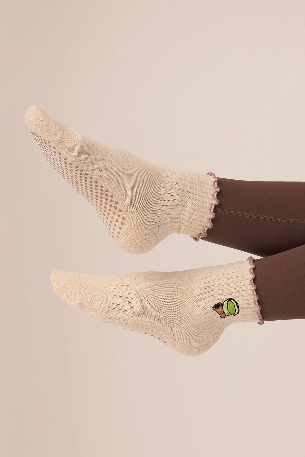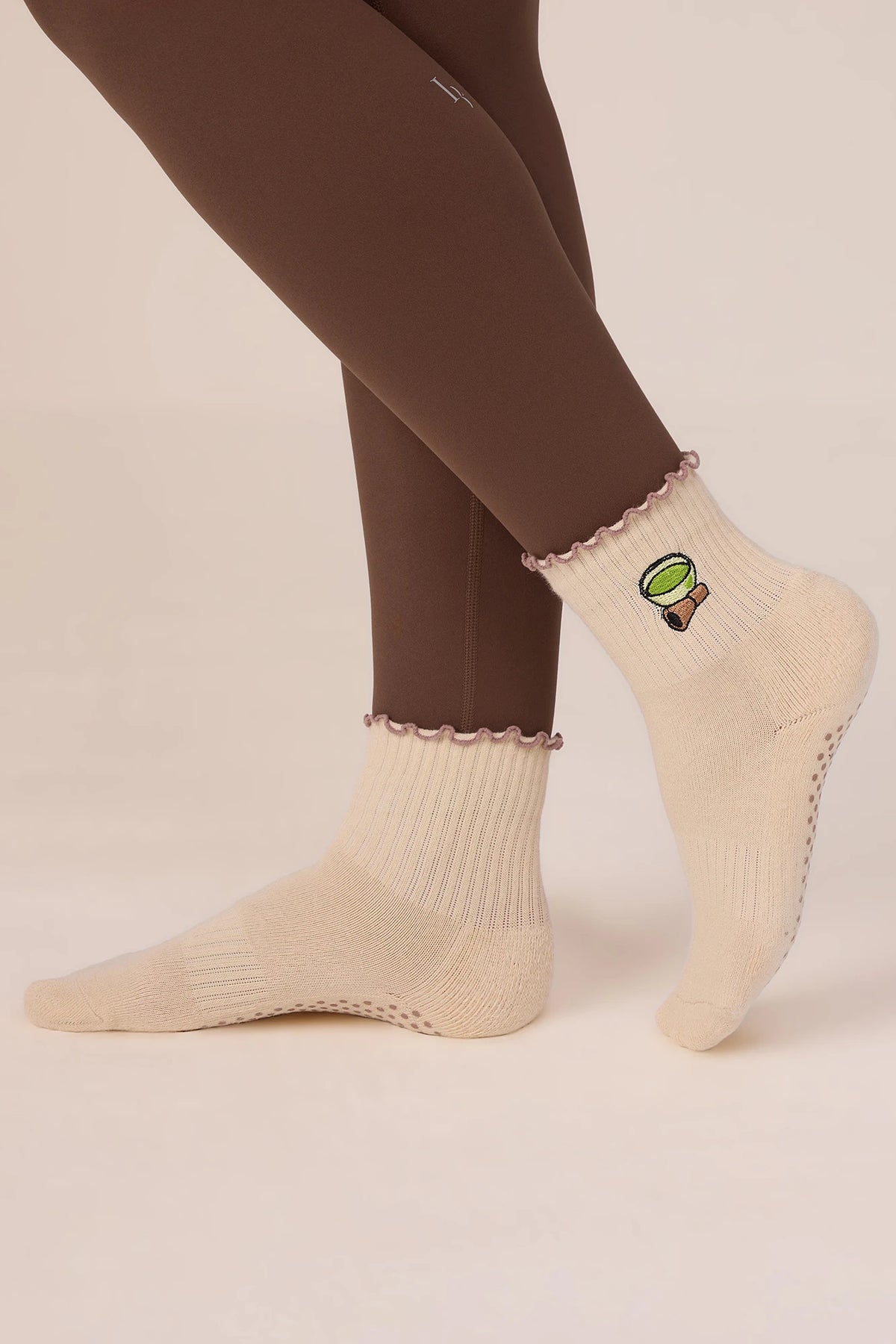 Whisk Taker Socks offer the perfect balance of grip, elegance, and performance.A beautifully embroidered illustration of a traditional matcha tea bowl adds an artistic touch, symbolizing calm, ritual, and mindful living. These crew socks feature a superior grip sole, ensuring stability and support throughout your Pilates practice.
